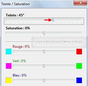 Menu Réglage > Teinte/saturation: Teinte = 45°. Saturation= 0%