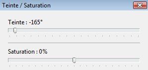 25.Menu Réglage > Teinte/Saturation. Teinte =-165. Saturation= 0°
