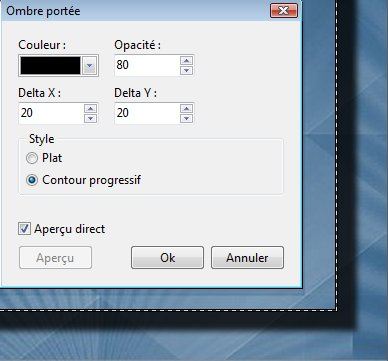 23. Menu Filtre > Esthétique > Ombre portée. Noir. Opacité= 80. X=Y= 20