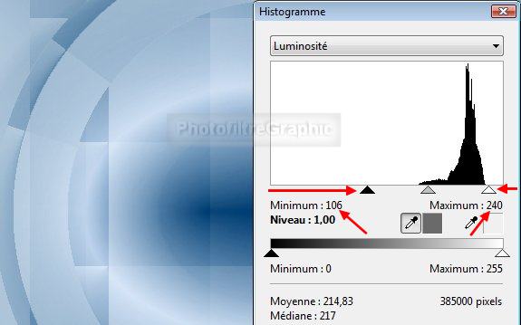14. Menu Réglage > Histogramme. Coulissez le curseur noir du haut pour avoir Minimum à 106