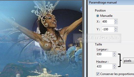 15.Clic droit dessus > Paramétrage manuel. Position Manuelle: X= 400 Y= -100. Taille sans changement