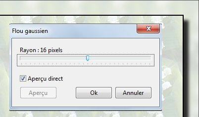 24h. Clic sur la vignette du Fond. Menu Filtre > Effet d'optique > Flou gaussien. Rayon= 16 pixels (ou 7 versions anciennes)
