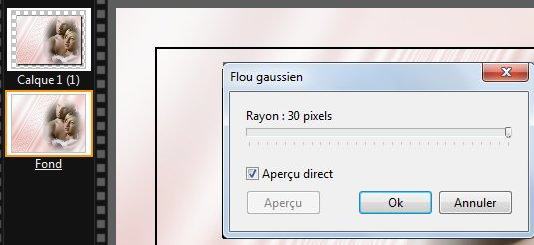 19h. Clic sur la vignette du Fond. Menu Filtre > Effet d'optique > Flou gaussien. Rayon:30 pixels (ou 12 pixels sur anciennes versions)