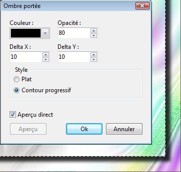 18. Menu Filtre > Esthétique > Ombre portée. Noir. Opacité= 80. X = Y= 10