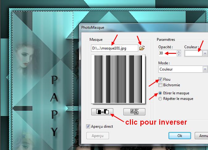 en l'inversant avec Photomasque. Opacité = 30. Couleur blanche. Etirer le masque.