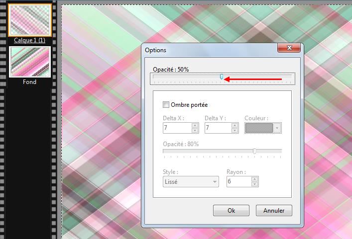 calque 2. Cochez Ombre portée. 7 / 7. Noir. Curseur Opacité du bas sur