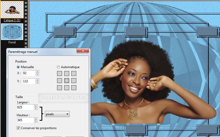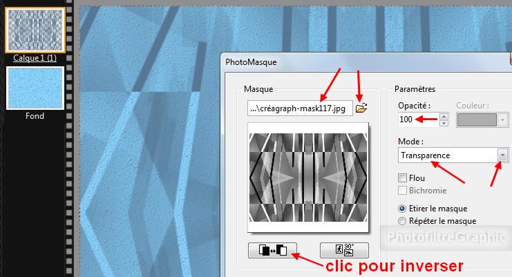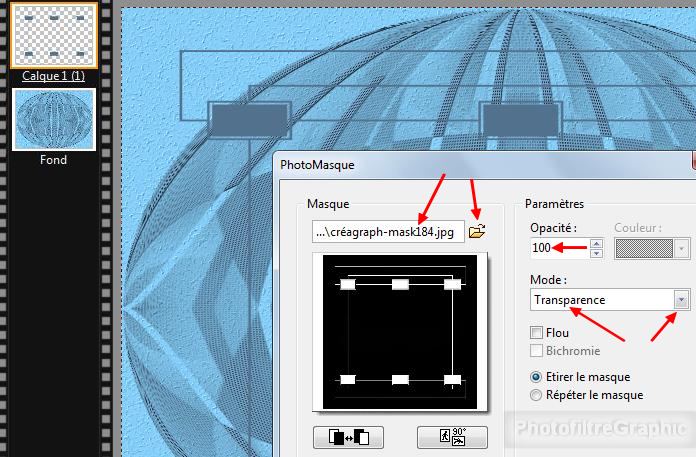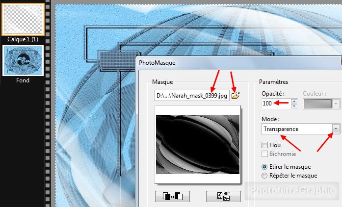 avec Photomasque. Opacité = 100. Mode Transparence. Etirer le masque