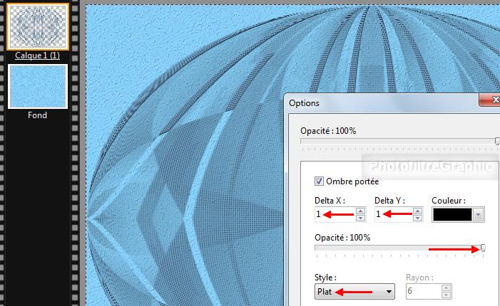 calque 1. Cochez Ombre portée. X= 1 et Y= 1. Noir. Curseur Opacité du bas sur