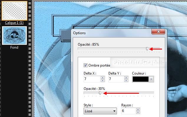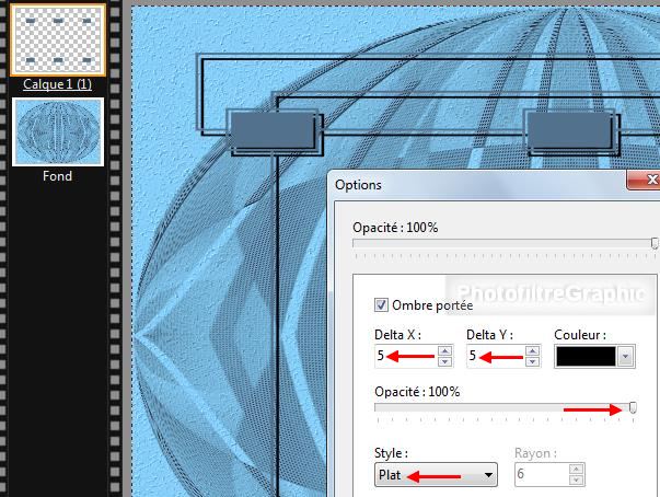 calque. Cochez Ombre portée. X= 5 et Y= 5. Noir. Curseur Opacité du bas sur