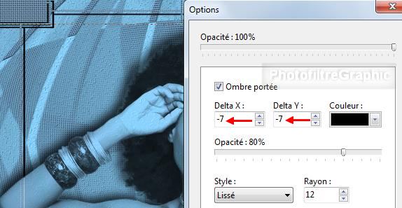 calque . Cochez Ombre portée. -7 et -7. Noir. Curseur Opacité du bas sur