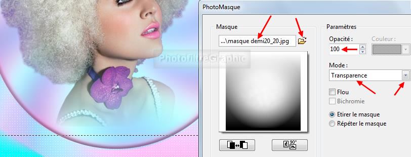 avec Photomasque du menu Filtre. Opacité = 100. Mode Transparence. Etirer le masque