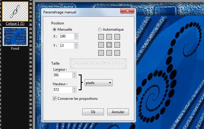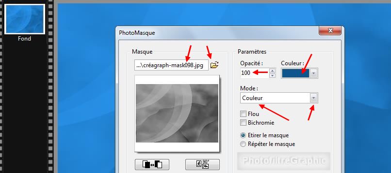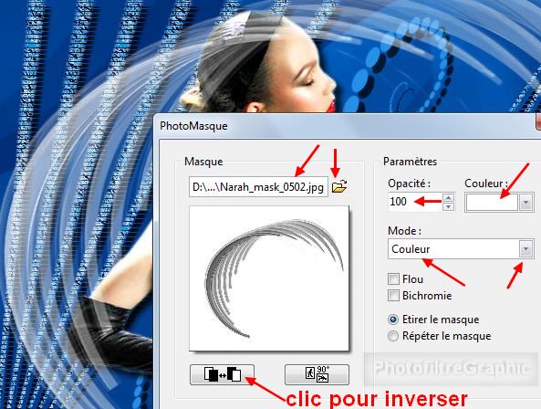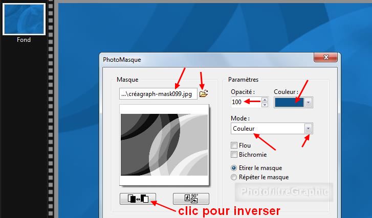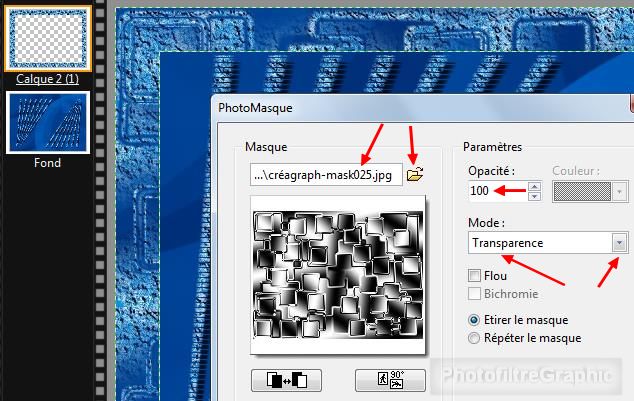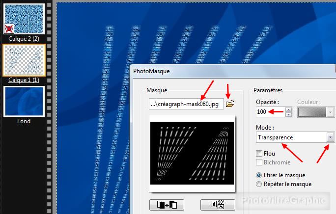 avec Photomasque. Opacité = 100. Mode Transparence. Etirer le masque