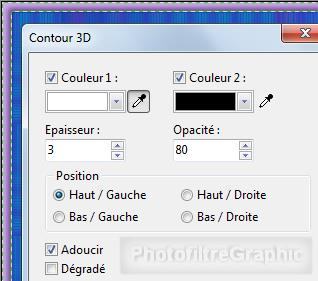 Contour 3D. Couleur 1=Blanc. Couleur 2= Noir. Epaisseur= 3. Opacité= 80.