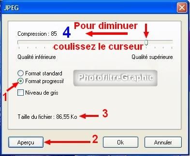 22.Vous pourrez cocher Format progressif (1),vous cliquerez sur Aperçu (2) et vous saurez le poids (3)