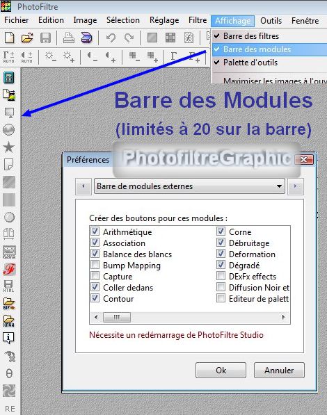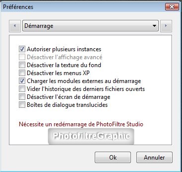 18.Remarque:Chaque fois que vous verrez inscrit Nécessite un redémarrage de Photofiltre,cela veut dire qu'il faut le fermer et le rouvrir
