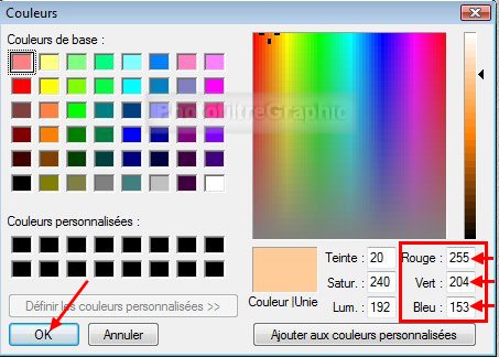 3. Dans le fenêtre des Couleurs qui s'ouvre, mettez 255 à côté de Rouge, 204 à côté de Vert, 153 à côté de Bleu
