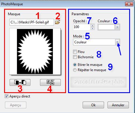 9.Choix de la couleur du masque (6) 10.Réglage de l'opacité du calque (7) 11.Autres possibilités :Flou, Bichromie (8) 12.Etirer le masque = un seul masque sur toute l'image (9) 13. Répéter le masque = le masque est répété plusieurs fois |