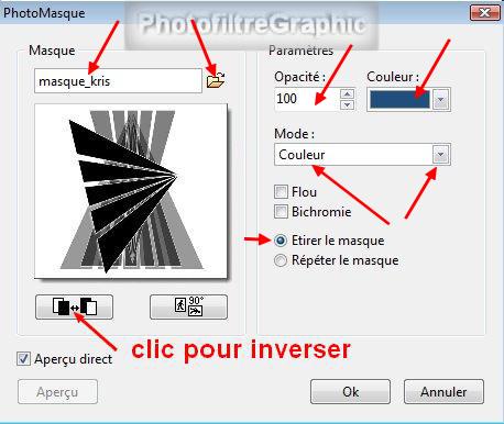 12.Appliquez le masque kris en l'inversant avec Photomasque du menu Filtre. Couleur d'avant-plan. Opacité= 100. Etirer le masque