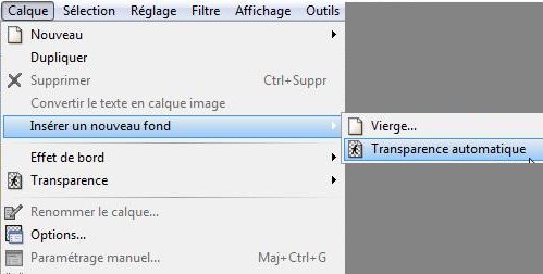 9.Ajoutez un nouveau fond transparent: Menu Calque > Insérez un nouveau fond > Clic sur Transparence automatique