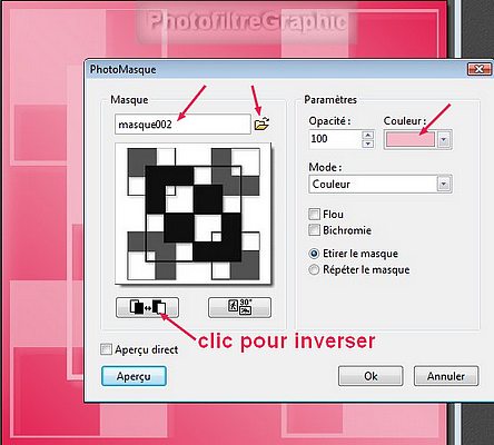 11.Appliquez le masque002 inversé. Menu Filtre > Photomasque. Opacité = 100. Couleur rose de l'arrière-plan