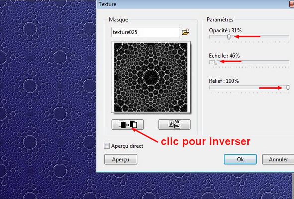 10.Appliquez la texture025 en l'inversant. Menu Filtre > Texture > Autre