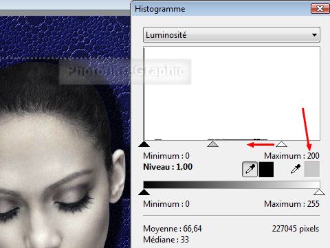 26.Menu Réglage > Histogramme. Coulissez le curseur blanc du haut pour avoir Maximum à 200