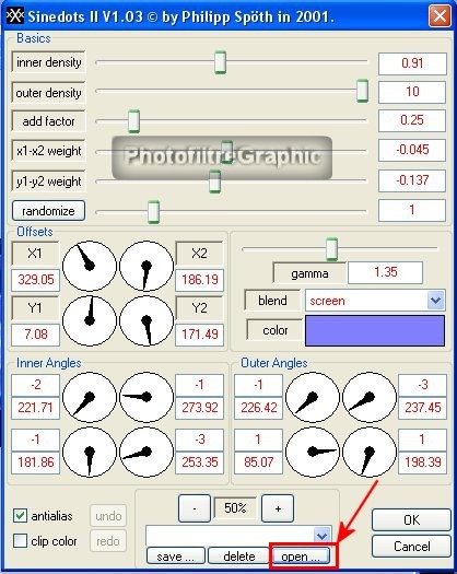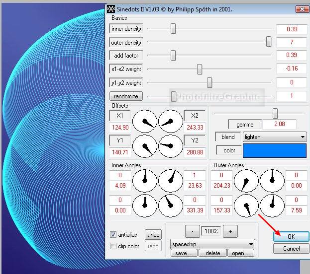 63. Menu Filtre > Filtre 8BF > DragonFly > Sinedots II. Cliquez sur Open