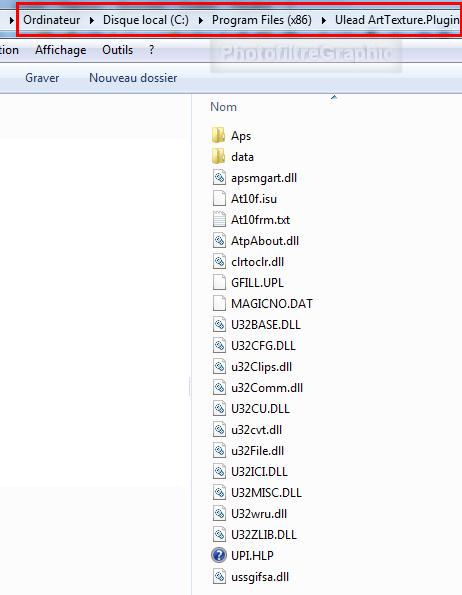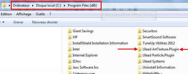 21. REMARQUE Ce plugin va s'installer à 2 endroits: 1. Dans Program files ou Program files(86) ou Programmes 2. Dans le dossier Ulead Art Texture que vous avez créé à la ligne 3 |