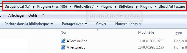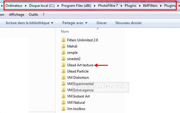 4.Avec Seven ou Vista 5 .Clic sur Démarrer > clic sur Ordinateur 6 .Double-clic sur Disque local C:\ 7 .Double-clic sur Program files ou Programmes 8 .Double-clic sur PhotoFiltre ou PhotoFiltre 7 9. Double-clic sur Plugins 10. Double clic sur 8bfFilters 11.Double-clic sur Plugins 12 .Clic, en haut, sur Nouveau dossier 13. Ou clic, en haut à gauche, sur Organiser et clic sur Nouveau dossier 14 . A la place de Nouveau dossier, écrivez Ulead Art texture