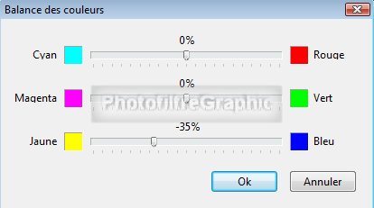 3.Menu Réglage > Balance des couleurs .Coulissez vers le jaune à -35%