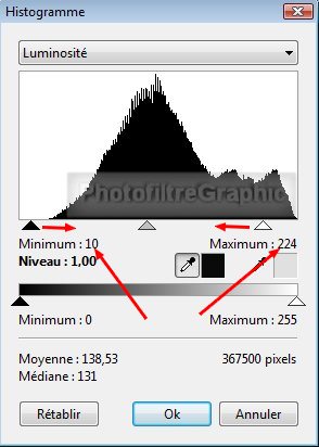 4a.Menu Réglage > Histogramme. Coulissez le petit triangle blanc du haut pour avoir Maximum= 224