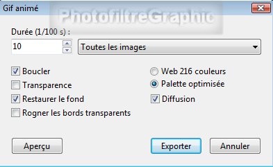 64.Menu Outils > Gif animé. Boucler. Restaurer le fond. Palette optimisée. Diffusion. Durée 10