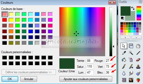 2.Mettez en couleur d'avant-plan (explications) le Vert-foncé R=27 V=73 B=36