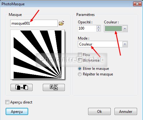 8.Appliquez le masque001:Menu Filtre > Photomasque. Opacité = 100. Couleur vert-clair mise en avant-plan. Etirer le masque