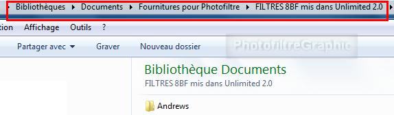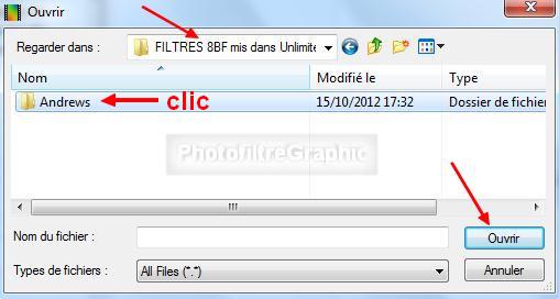 6.Cliquez sur Import et cherchez le dossier Andrews mis dans le dossier Filtres 8BF mis dans Unlimited 2.0 (ligne 3, ci-dessus)