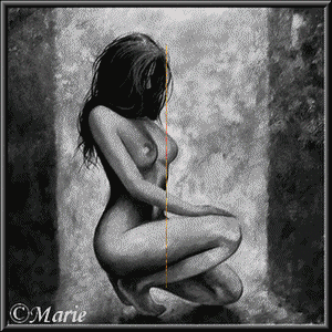 Image noire et blanc en Fond (la dame accroupie), en calque 1: les arbres et en