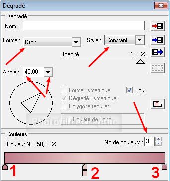 6.Forme = Droit. Nombre de couleurs: 3. Angle = 45,00 (cliquez sur la pointe pour le sélectionner)