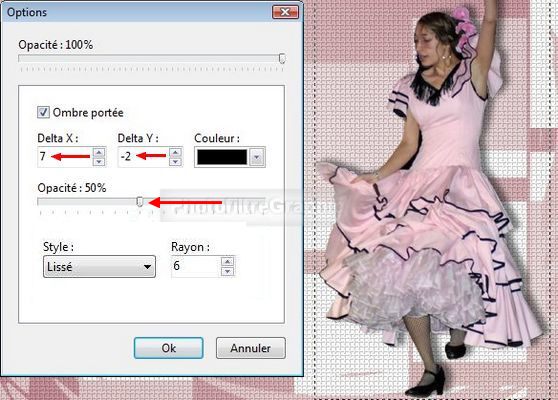 19.Double-clic sur la vignette. Cochez Ombre portée. 7 / 7. Noir. X=7. Y=-2 Opacité du bas sur 50%