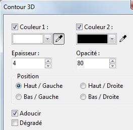 39.Menu Filtre > Esthétique > Contour 3D: Couleur 1=Blanc. Couleur 2=Noir. Epaisseur=4. Opacité=80. Haut/Gauche. Adoucir
