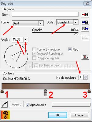 6.Forme = Droit. Nombre de couleurs: 3. Angle = 45,00 (cliquez sur la pointe pour le sélectionner)