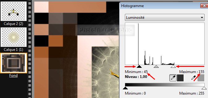 29.Menu Réglage > Histograme. Coulissez le curseur noir du haut pour obtenir un Minimum de 45
