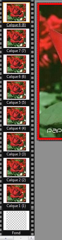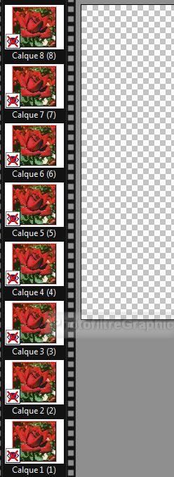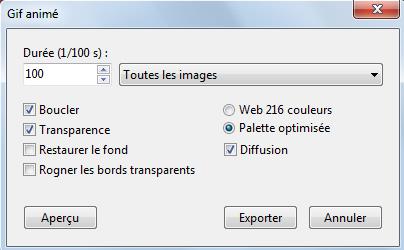 25. Menu Outils > Gif animé avec les réglages: Durée 100 à Toutes les images. Boucler. Transparence. Palette optimisée
