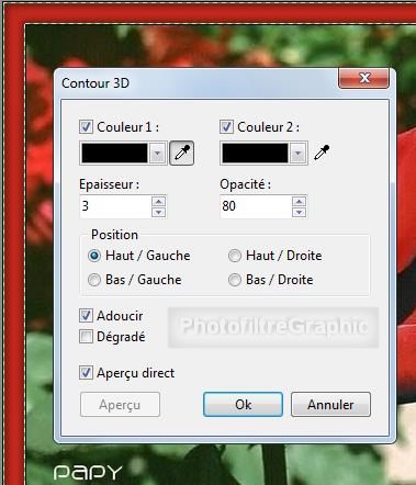 9. Menu Filtre > Esthétique > Contour 3D. Couleur 1=Noir. Couleur 2=Noir. Epaisseur= 3. Opacité= 80. Haut/Gauche. Adoucir