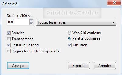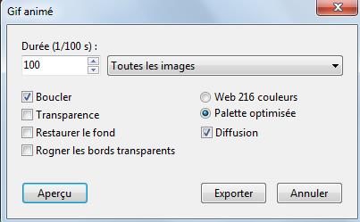 46. Menu Outils > Gif animé avec les réglages: Durée 100 à Toutes les images. Boucler. Ne cochez pas Restaurer le fond. Palette optimisée