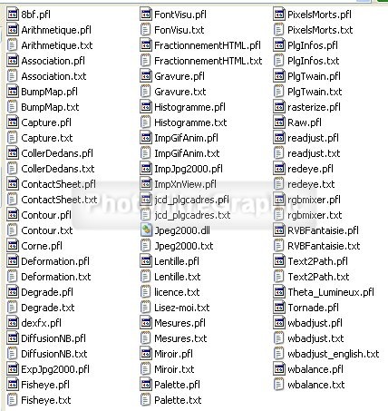 Les Plugins 8BF (ou Filtres 8BF) 46.Au fil des années, ces plugins atteignent des poids très importants, aussi, je propose de les installer dans un dossier spécial plutôt que dans le dossier Plugins avec les Plugins.pfl 47.Vous les rangerez dans le sous-dossier Plugins 8BF créé ci-dessus dans le dossier Fournitures pour PhotoFiltre (ou ailleurs voir ci-dessous) 48.Dans ce dossier Plugins 8BF, il est aussi recommandé d'ouvrir un sous-dossier pour chaque plugin 8BF que vous chargerez sinon, au bout de quelques années, vous serez complètement embrouillé car voilà ce qu'il peut contenir...etc...