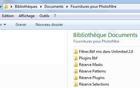 69.Précision importante pour les Plugins 8BF Je propose de créer ce dossier dans les Fournitures pour Photofiltre mais ce dossier peut être créé n'importe où dans votre ordi, en particulier si votre disque dur est partitionné, vous pouvez le créer sur une autre partition L'essentiel, ce sera de bien mettre le "chemin" pour venir à ce dossier dans les Préférences (ligne 47 ici ) Si vous avez d'autres logiciels de graphisme,il vous suffira de bien indiquer le chemin pour venir à ce dossier Ainsi, vous aurez TOUS vos 8BF à une seule place