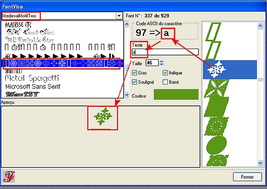 45.Si vous avez des dingbats (polices de motifs):en cliquant sur un motif à droite,vous saurez sur quelle lettre il faut taper pour avoir ce motif