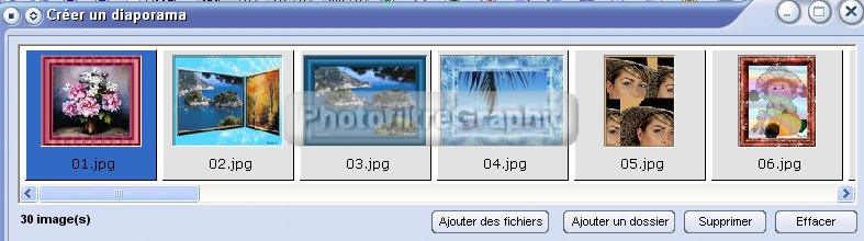 29.Dans la fenêtre 1 du haut,vous placerez toutes les images qui seront dans le Diaporama mais,auparavant,supprimez ce qui s'y trouve en cliquant sur le bouton D Effacer