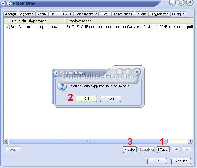 45.Dans cette fenêtre,cliquez sur 1 Effacer puis sur 2 Oui pour enlever la ou les musiques s'y trouvant