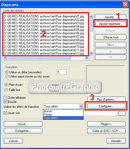47.Si vous mettez des Effets de transition entre chaque image,cliquez sur Configurer et choisissez ceux que vous voulez ou laissez-les tous sélectionnés